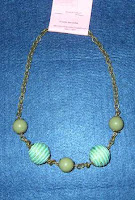 Colar com fio em corrente, com pompons em beje, conta grande em beje e bolas de madeira em verde.